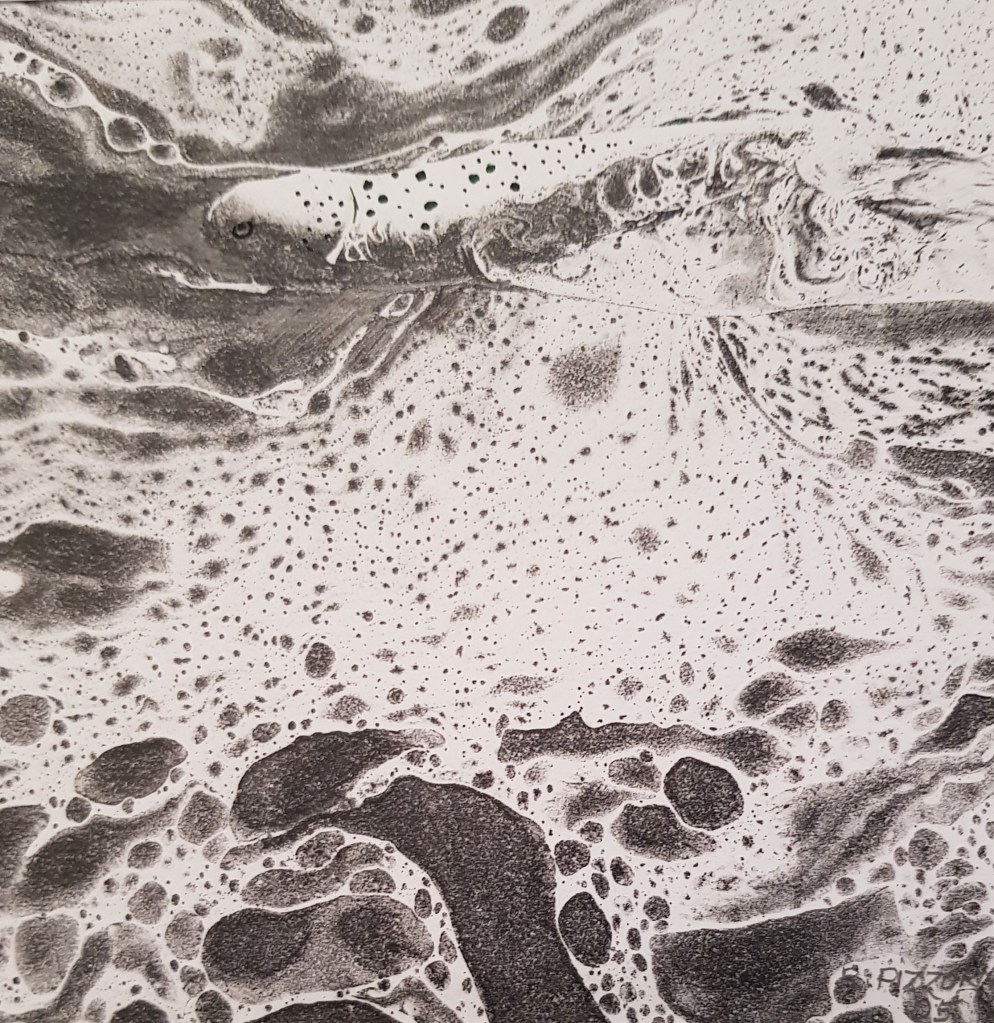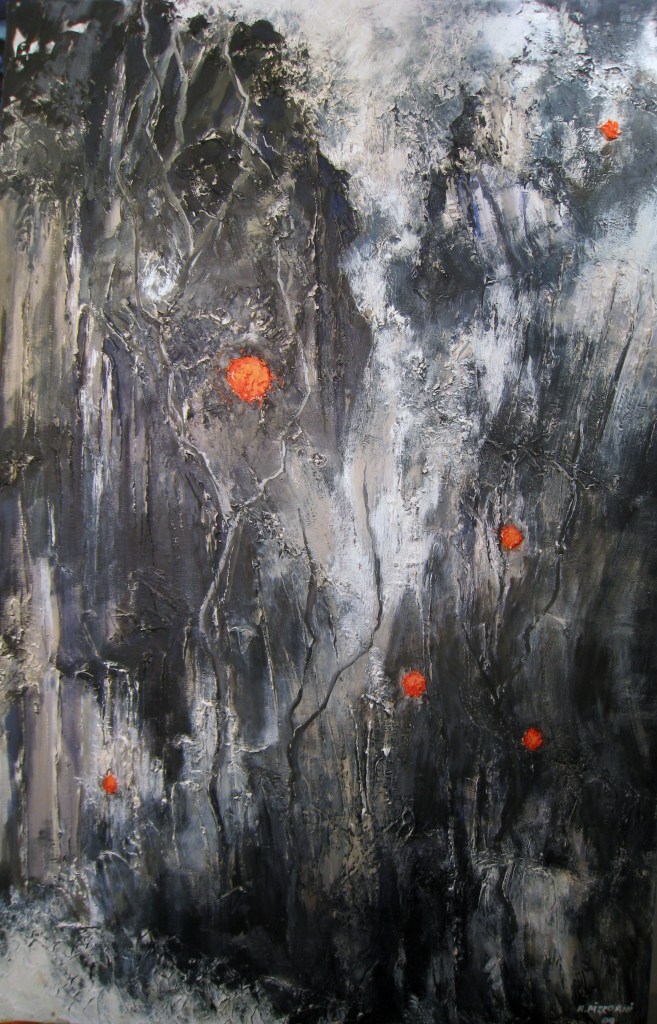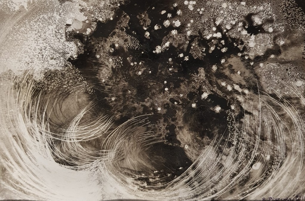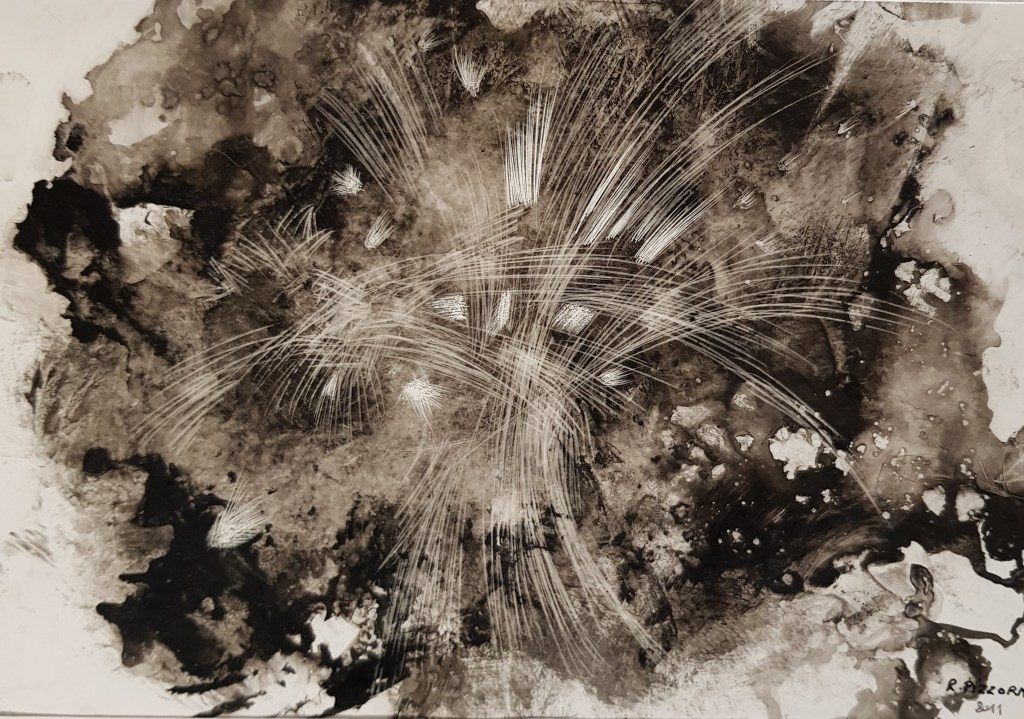 Meditations sur le temps qui passe (chronoscopies) , flux aléatoires (souvent guidés par la technique du papier cuve), ou simple liberté des formes et du trait qui s’émancipent de la couleur et rompent avec le réel immédiat, les abstractions racontent toujours une histoire et prennent origine dans une observation de la matière….La suite n’est qu’imaginations croisées, celle de l’artiste et celle du regardeur…